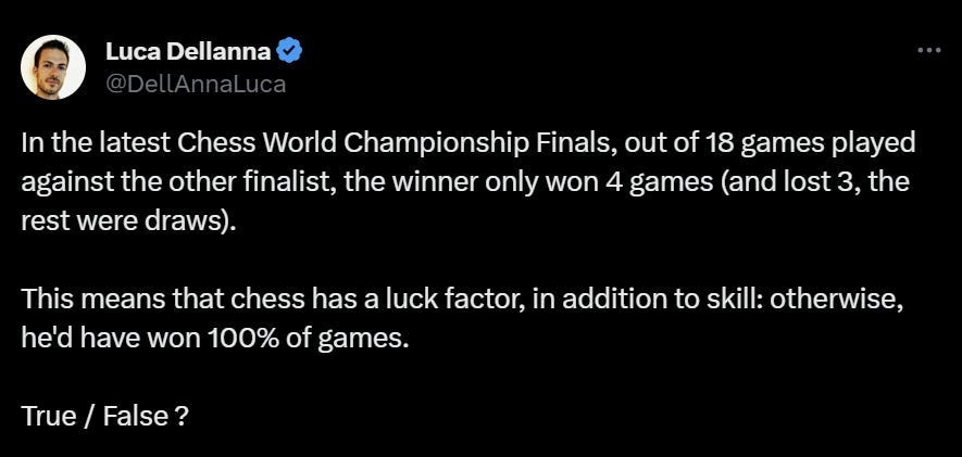 Chess, in itself, is not a game of chance. The rules and win conditions are strict constraints. Pieces cannot move in infinite ways. Both players have equal amounts of information about the game. Yet, even two equally-rated players won’t draw every game they play. They will exchange wins and losses. This is because uncertainty is injected into the game by the player-player matchup. Differences in which openings they’ve memorized (or not), which patterns they grok (or not), and other asymmetries create pockets of opportunity.