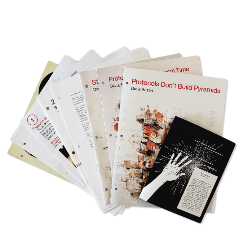 For those who want to get their hands on a hard copy, there are two options. First, there’s a limited-run print of 512 copies. It’s not going to be printed again. You can (and should) request a free kit at this link. If you miss the initial meatspace drop, I encourage you to pursue Option 2: bootlegging your own binder of your favorite protocol studies essays and artifacts using the online PDFs available, like David Lang’s Standards Make the World.