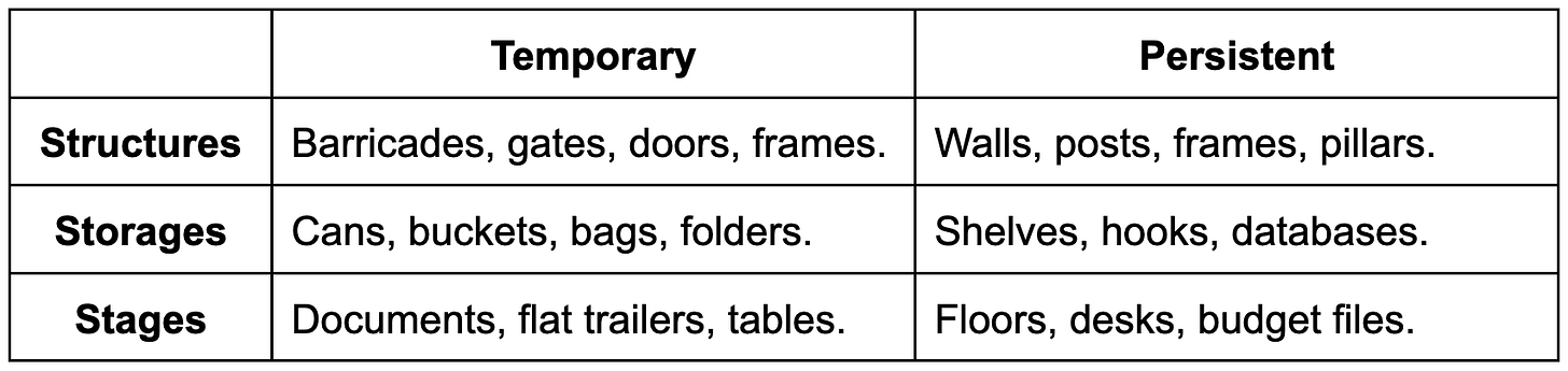 Getting your space-types messed up will get your operations messed up. Cluttered stages are inefficient and can be dangerous. Temporary storages that become persistent are usually not durable enough, and increase maintenance burdens quite a lot. Structures, both temporary and persistent, are typically harder to change but provide a lot of potential if used intelligently.